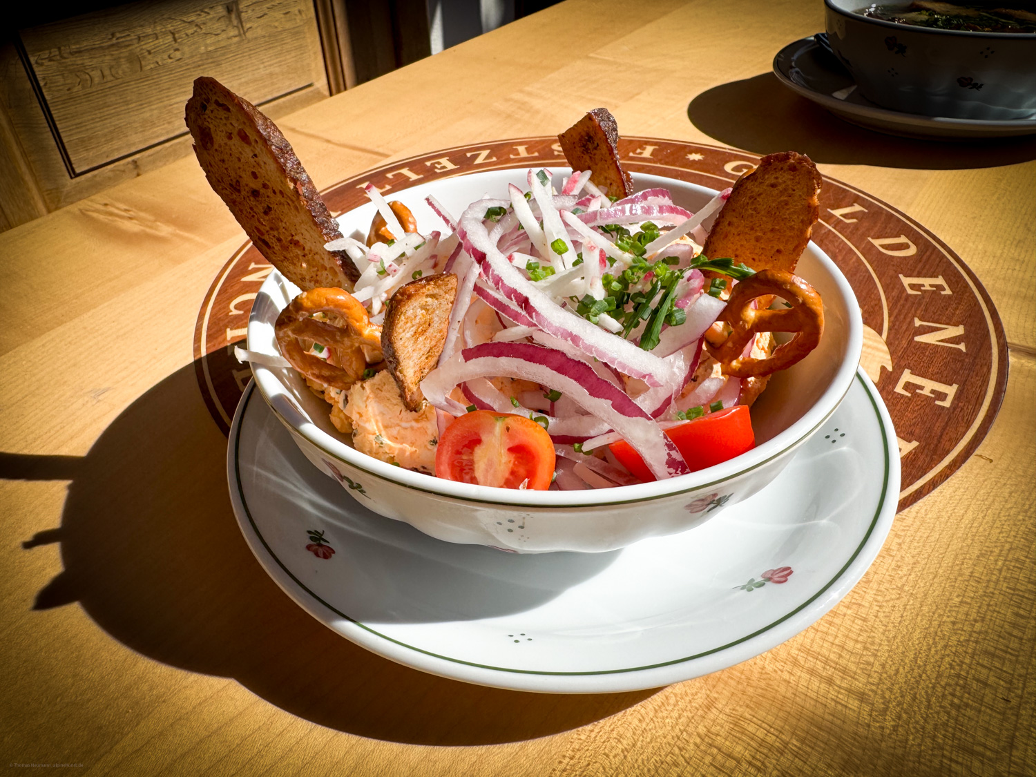 Herzhaftes, geröstetes Breznbrot belegt mit zartem Putenschinken und würzigem Bergkäse, dazu knackige Radieserl, Essiggurken, frischer Mixsalat und ein Schnittlauch-Spiegelei obendrauf. Deftig, frisch und genau das Richtige nach einer langen Nacht – nur im Goldenen Hahn.