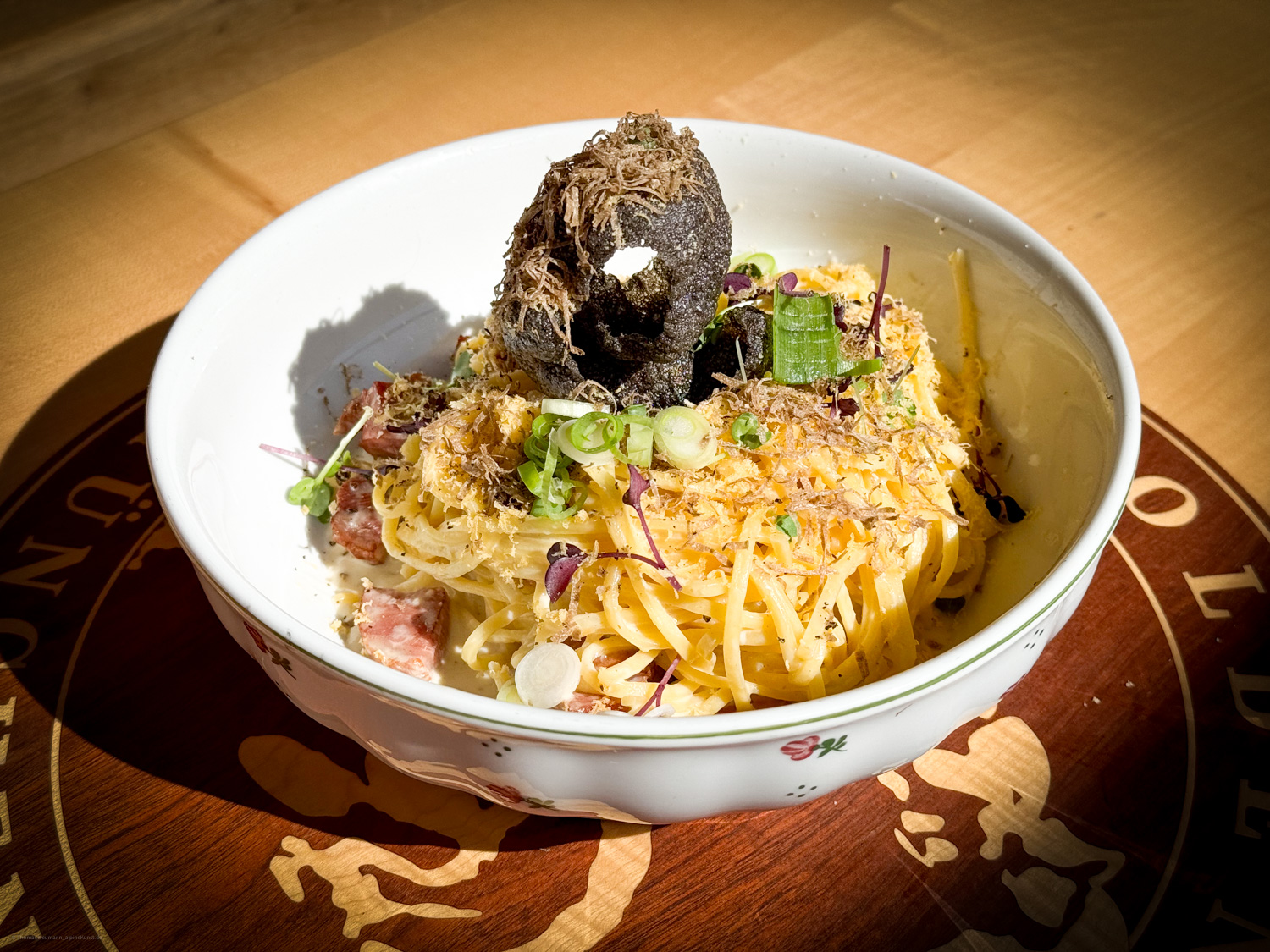 – Zartes Fleisch in knuspriger Parmesan-Eihülle, serviert auf aromatischen Rucola-Bandnudeln. Dazu getrocknete Tomaten und eine fein-würzige Basilikum-Tomaten-Soße. Ein leichtes, mediterranes Gericht für Genießer – frisch, hausgemacht und ideal für die Mittagspause im Goldenen Hahn.
