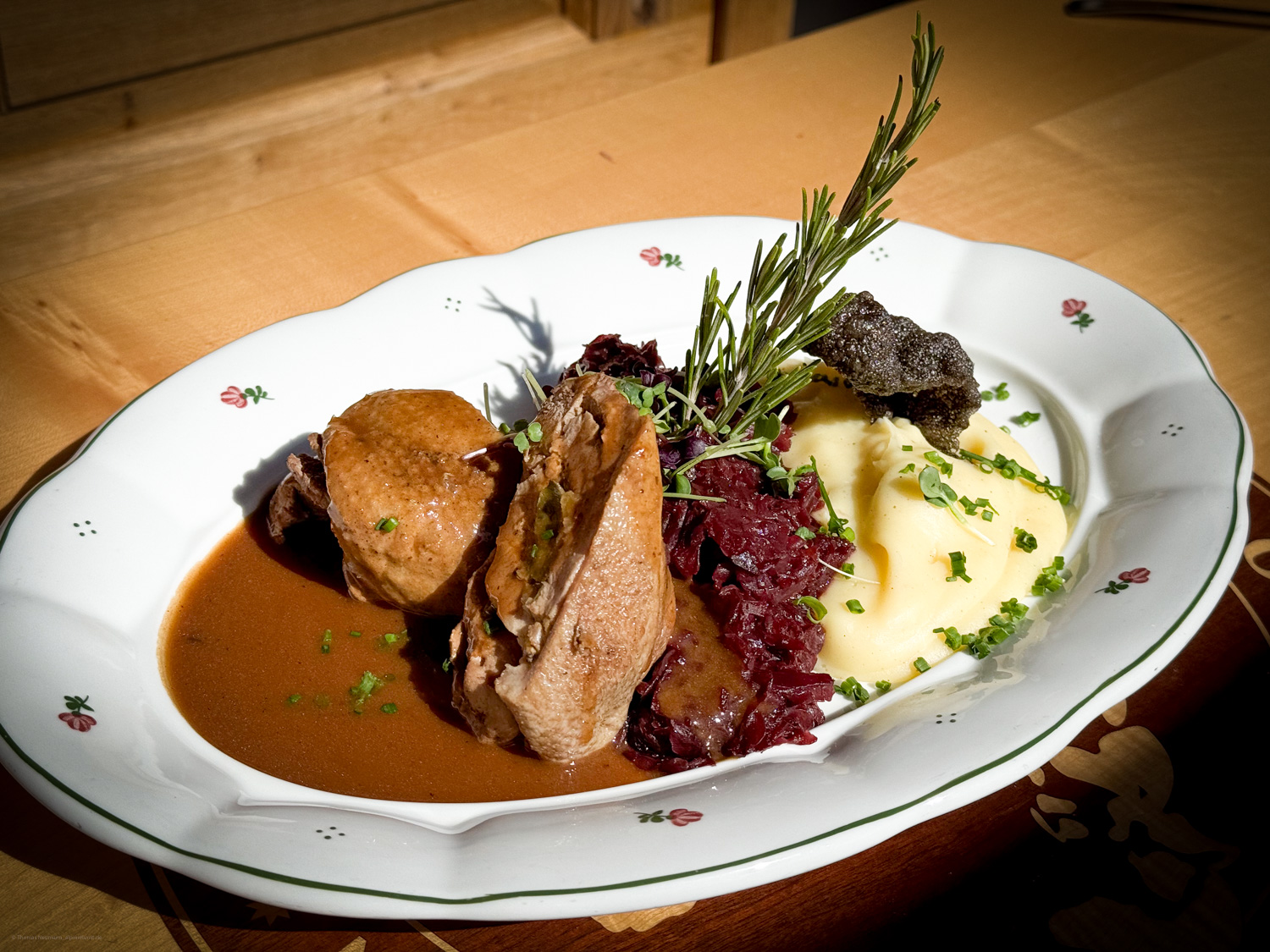 – Zart und auf den Punkt gegart, trifft die Entenbrust auf buntes mediterranes Gemüse und eine cremige Kräuterpolenta. Ein harmonisches Zusammenspiel aus kräftigem Aroma und feiner Würze – leicht, elegant und perfekt für eine genussvolle Mittagspause im Goldenen Hahn.